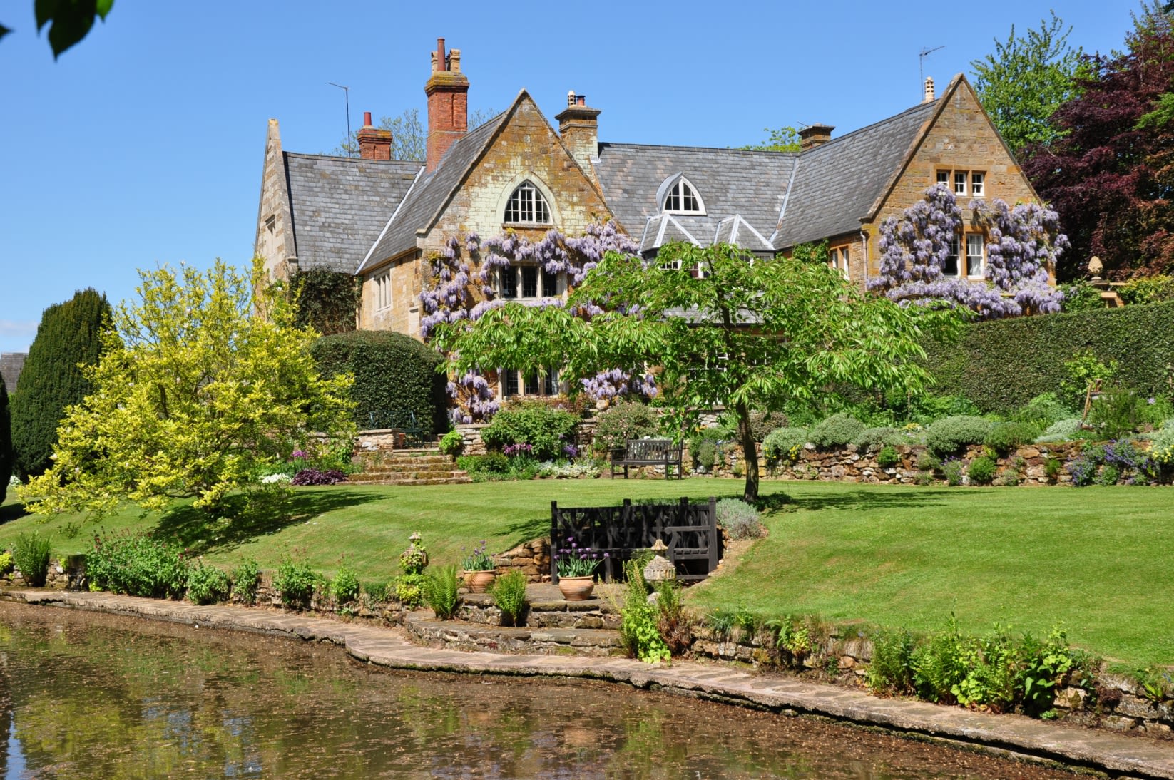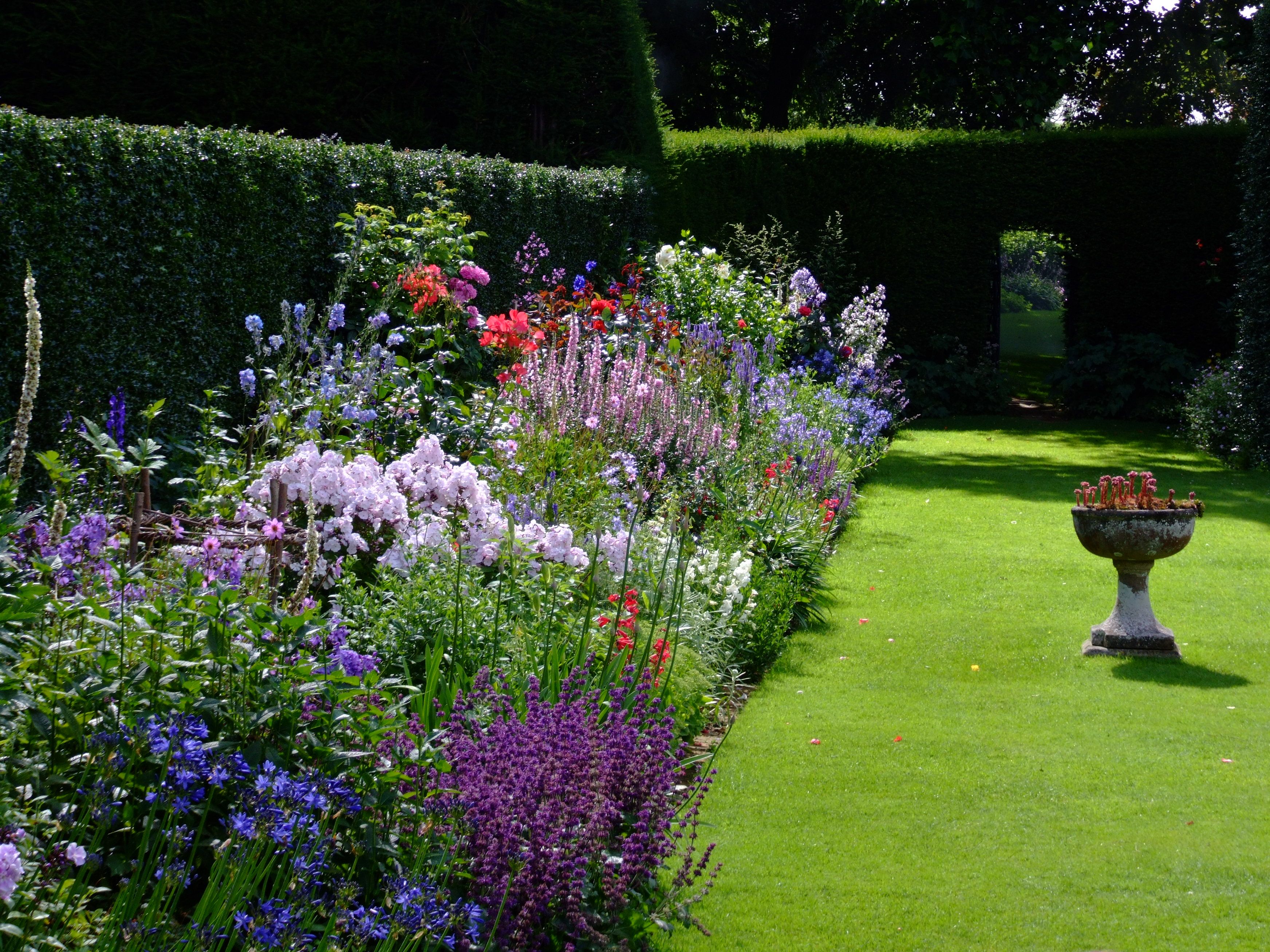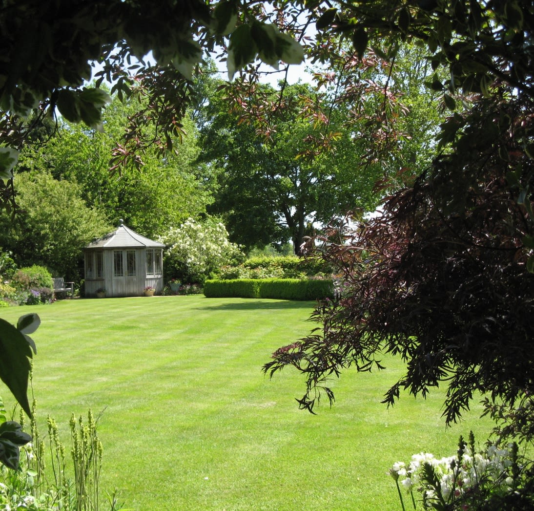 An old-fashioned English country garden surrounding a stone house with large lawns, herbaceous borders, mature trees and an orchard.