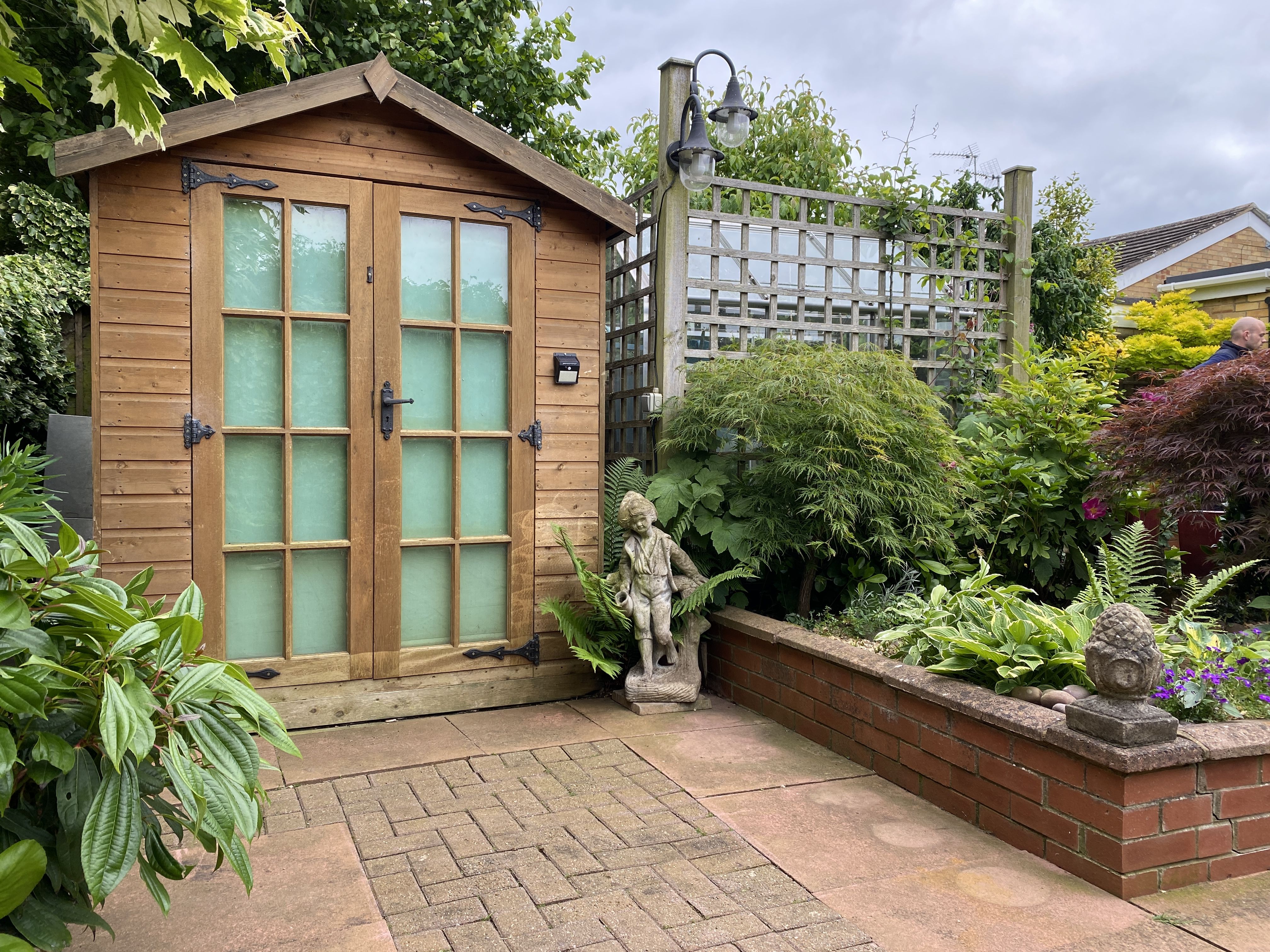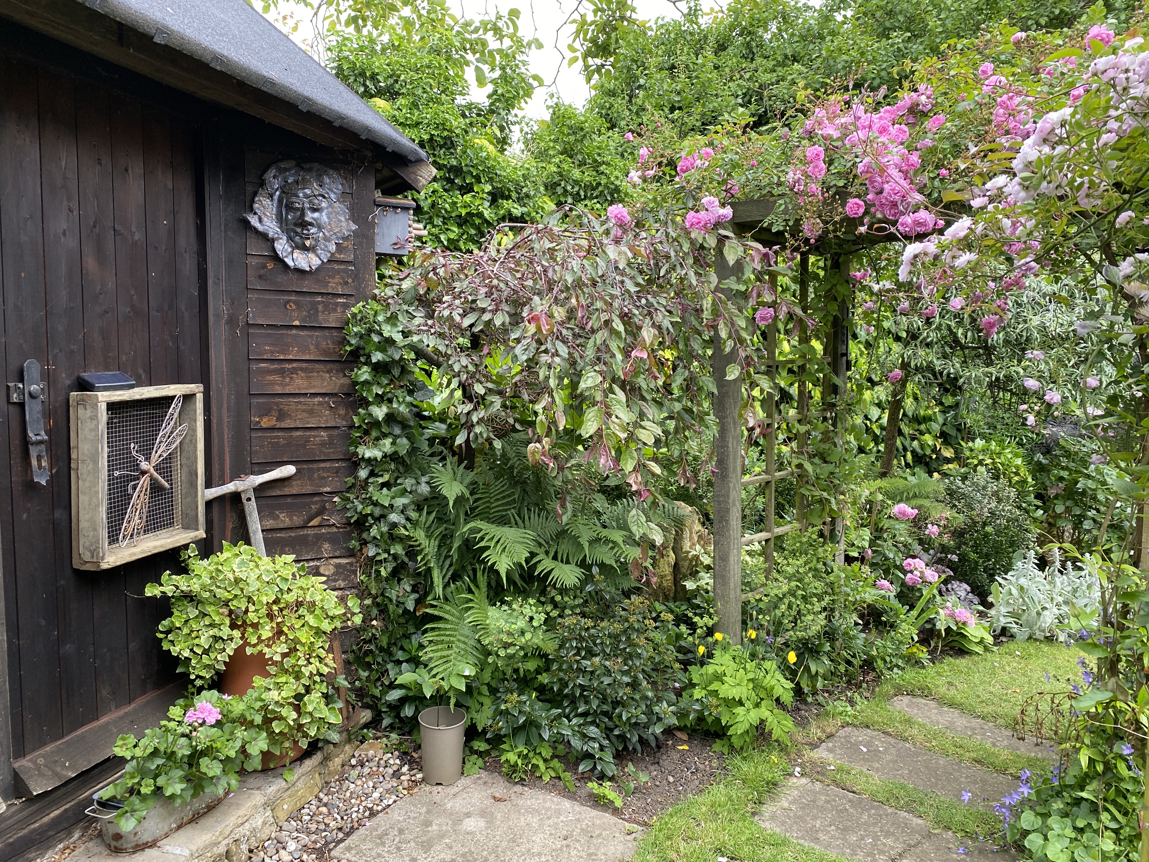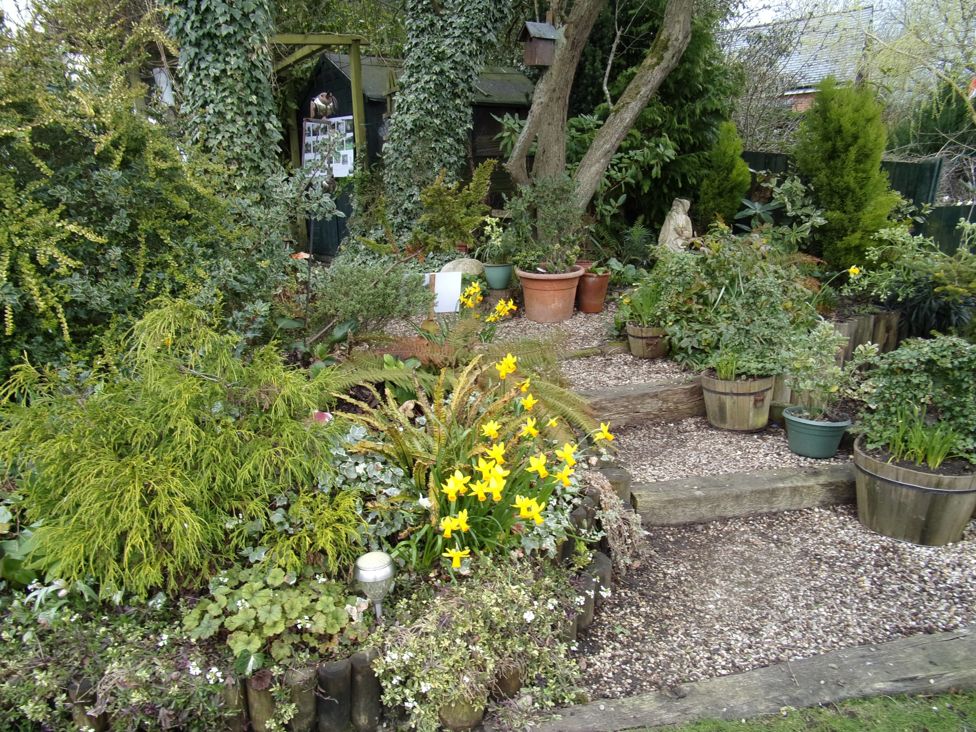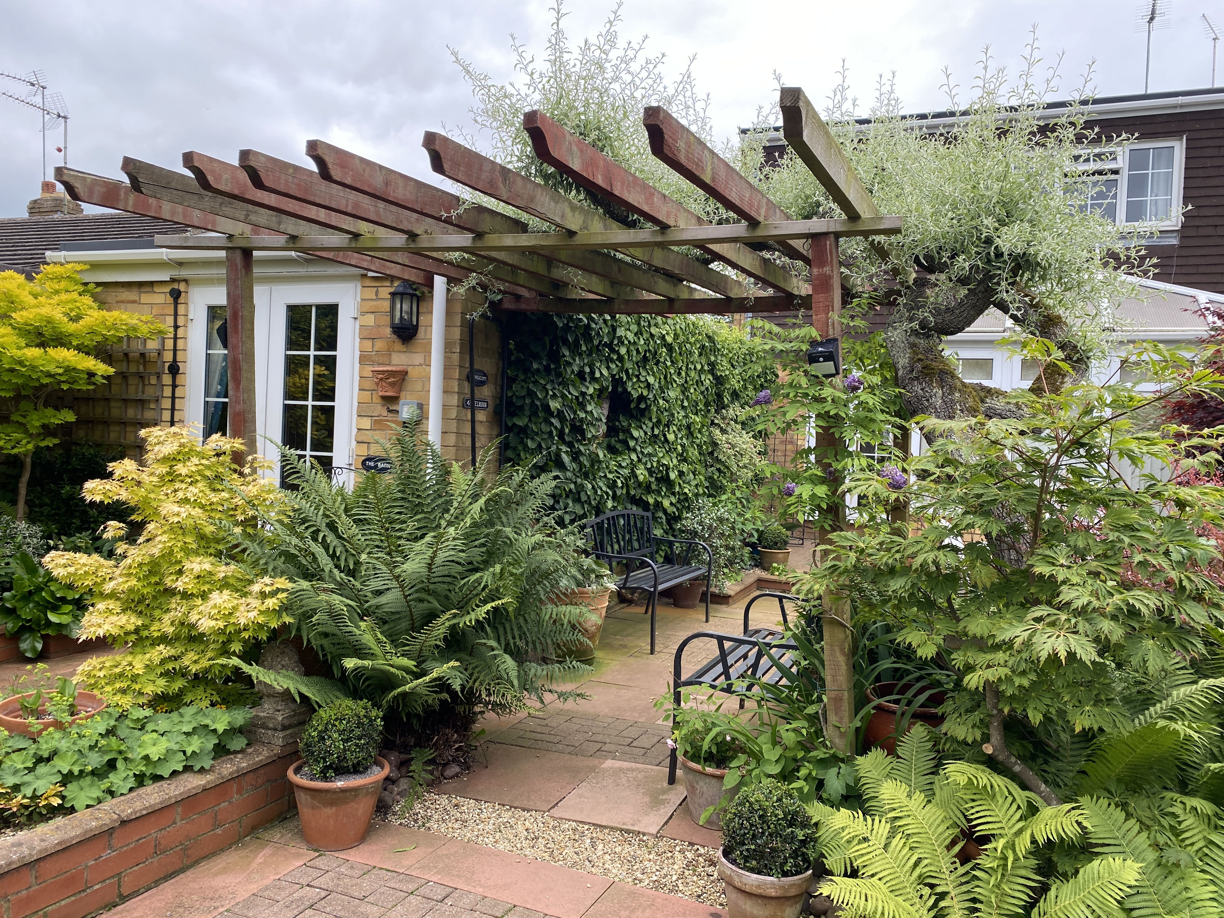 A flower arranger’s garden on a housing estate, with three garden rooms, water features, and various plants.