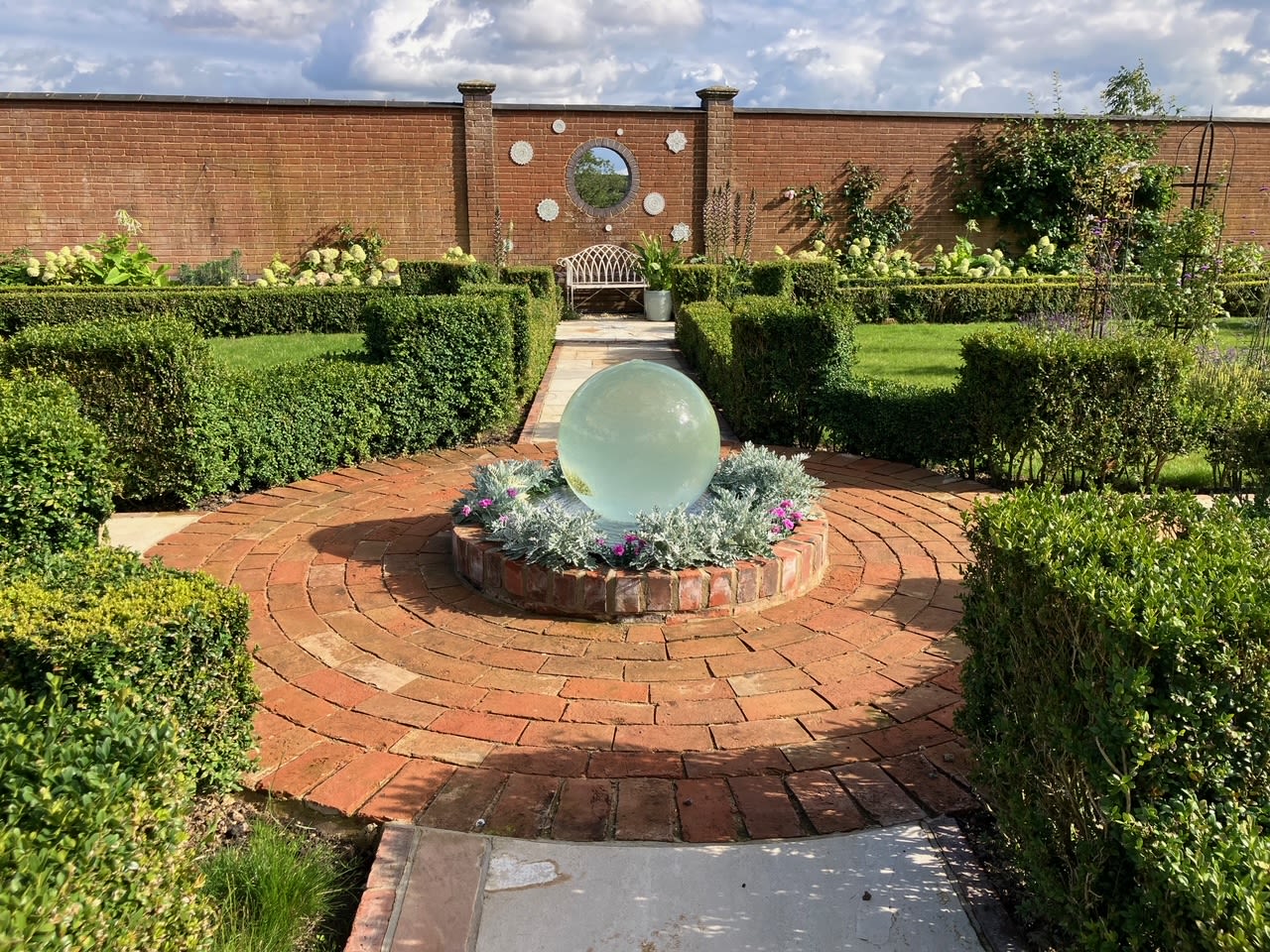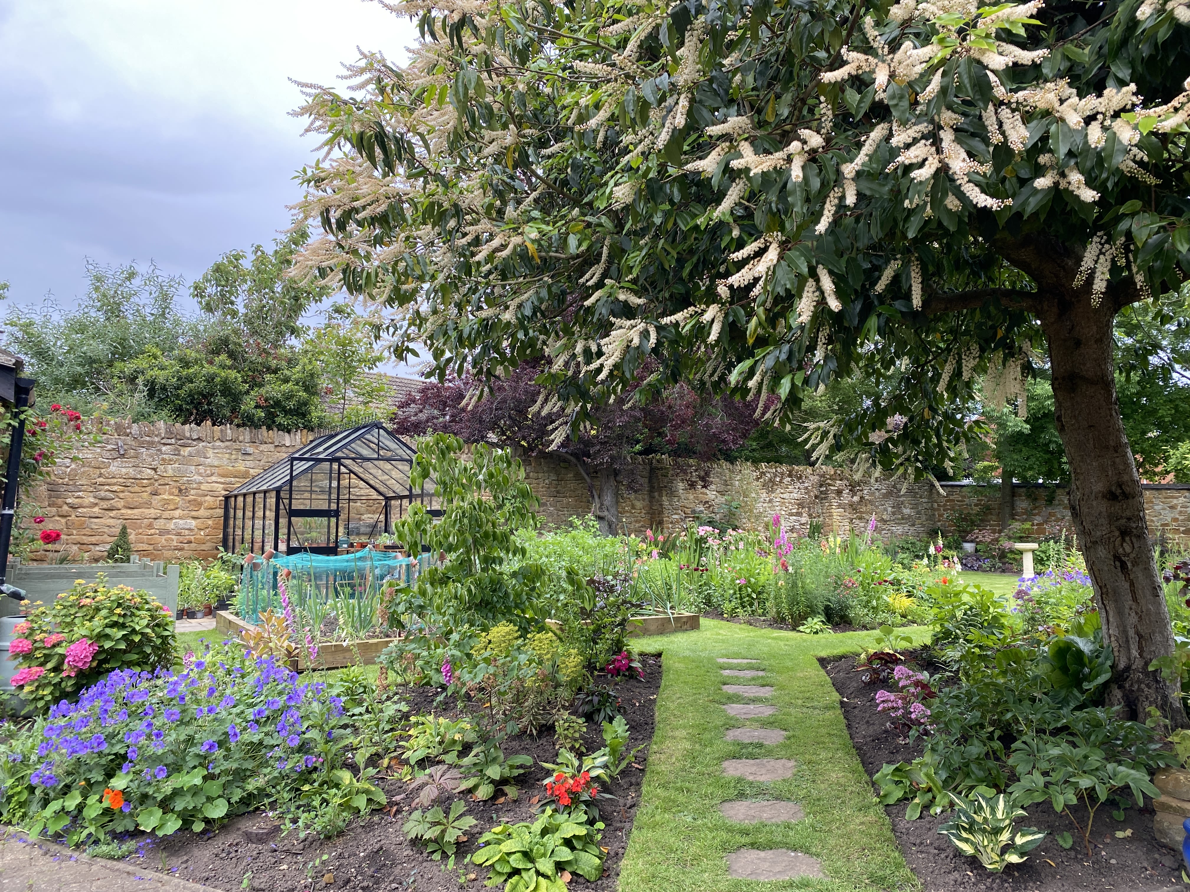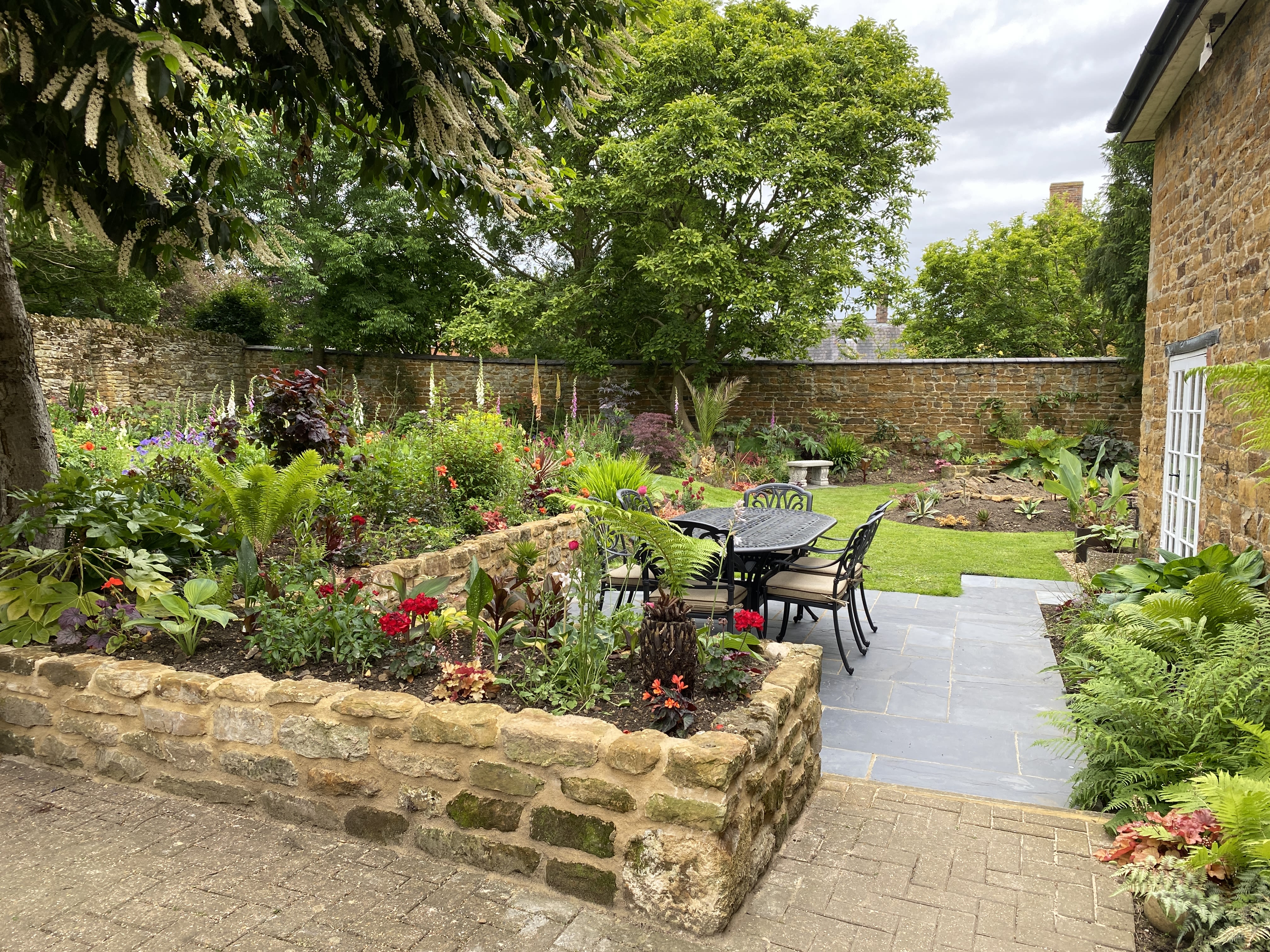 A medium-sized garden next to a Grade II-listed stone building, complete with various planting styles, fully walled with Northamptonshire ironstone.